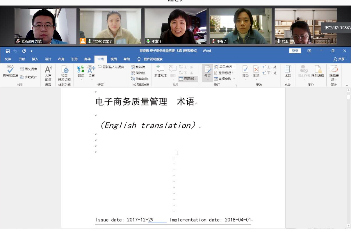 2021年2月4-5日,全國(guó)電子商務(wù)質(zhì)量管理標(biāo)準(zhǔn)化技術(shù)委員會(huì)(SAC/TC563)在杭州及線上組織召開(kāi)《電子商務(wù)質(zhì)量管理 術(shù)語(yǔ)》等5項(xiàng)國(guó)家標(biāo)準(zhǔn)外文版審查會(huì)。來(lái)自中國(guó)物品編碼中心、中國(guó)標(biāo)準(zhǔn)化研究院、中國(guó)檢驗(yàn)檢疫科學(xué)研究院、中國(guó)計(jì)量大學(xué)、杭州市標(biāo)準(zhǔn)化研究院、麥斯達(dá)夫標(biāo)準(zhǔn)化事務(wù)所等單位的專家組成審查專家組。