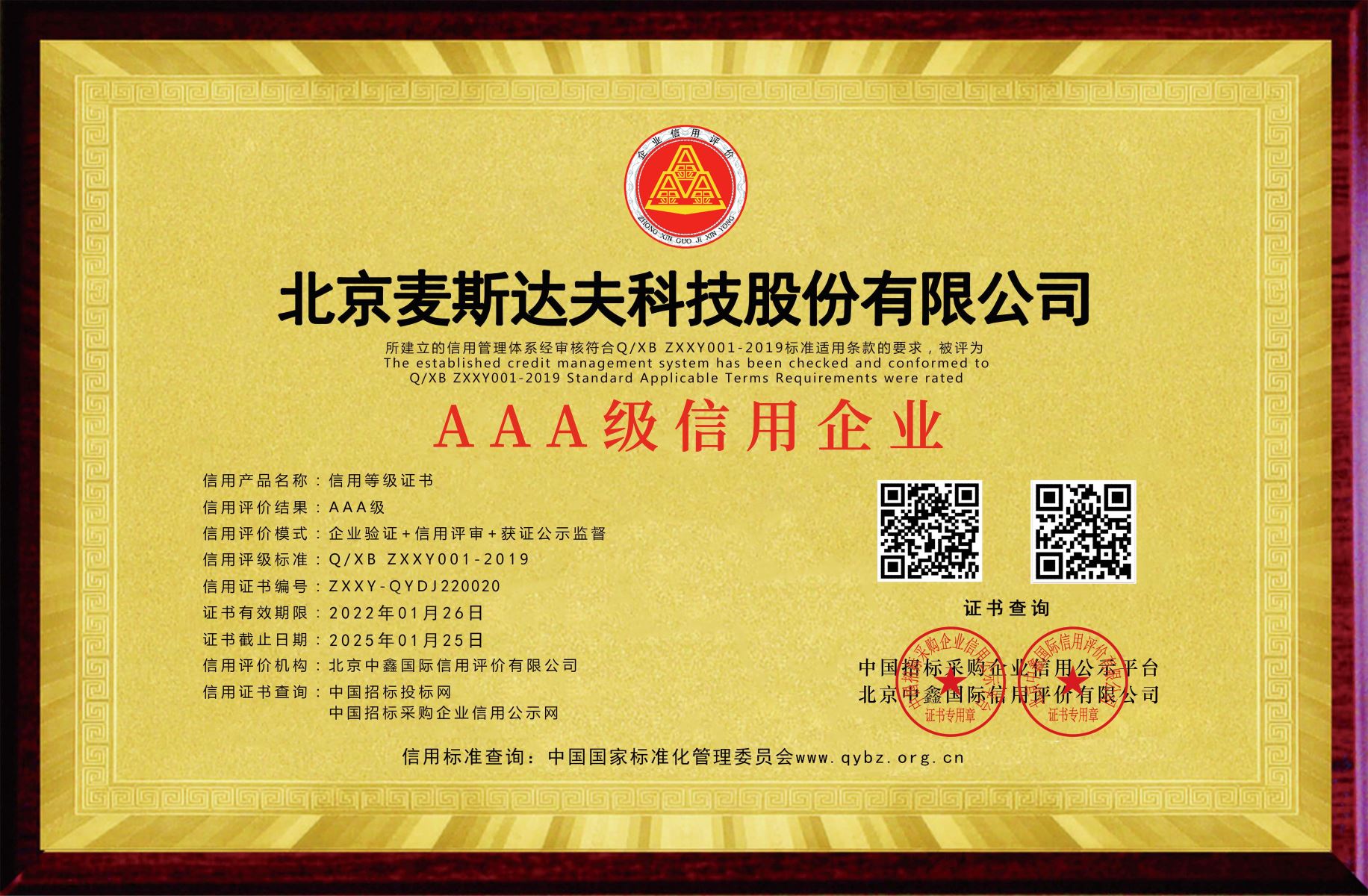 近日,北京麥斯達夫科技股份有限公司積極構(gòu)建行業(yè)領(lǐng)先的信用體系再傳佳績,被中鑫國信、中國招投標(biāo)(政府采購)企業(yè)信用評價與公示平臺授予“3A級企業(yè)信用等級”,并榮獲“3A級質(zhì)量服務(wù)信譽單位”、“3A級誠信經(jīng)營示范單位”、“3A級資信等級證書”、“3A級重服務(wù)守信用企業(yè)”及“3A級重質(zhì)量守信用企業(yè)”資質(zhì)。
